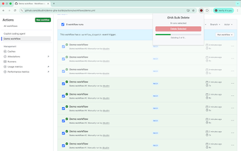 För att använda GHA Bulk Delete, navigera till en GitHub-repositories Actions-sida där kryssrutorna visas bredvid varje arbetsflöde. Användaren kan enkelt välja de körningar som ska tas bort och klicka på tilläggsikonen för att bekräfta raderingen. Detta verktyg är särskilt användbart för utvecklare som vill hålla sin GitHub Actions-historik ren utan att behöva gå igenom en tidskrävande manuell process.